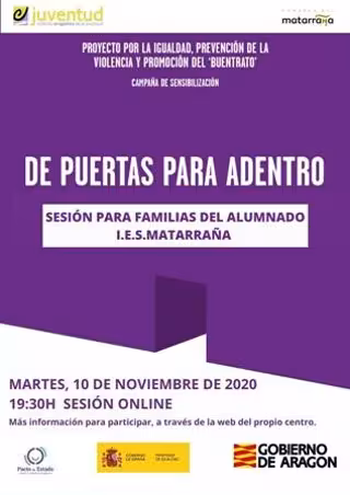 El IES Matarraña desarrolla el proyecto 'De puertas para adentro', una iniciativa que trabaja por la igualdad entre hombres y mujeres, en contra la violencia de género y la promoción del 'Buen Trato'. Dicha actividad está financiada por el Pacto de Estado contra la Violencia de Género.