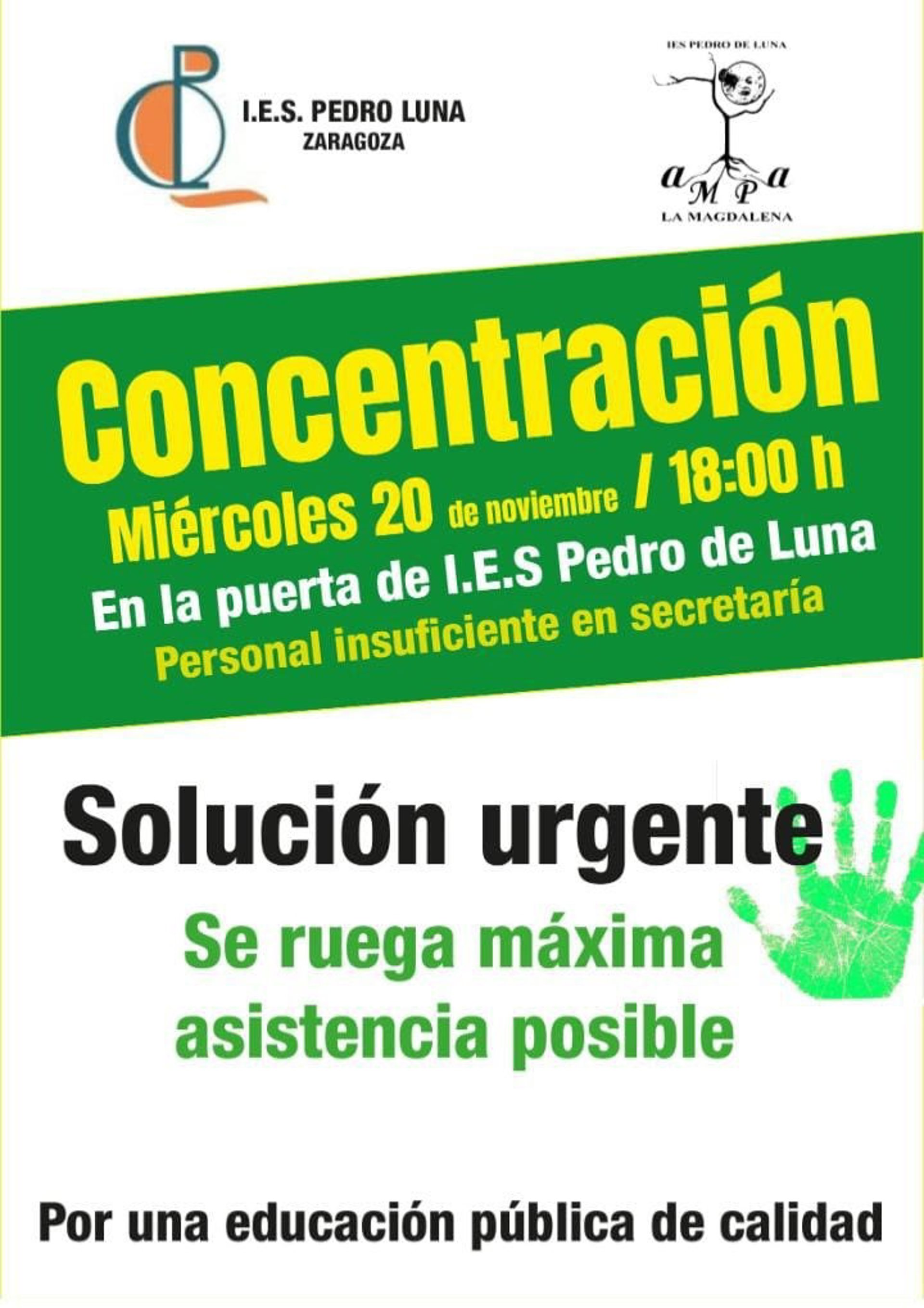 La comunidad educativa del IES Pedro de Luna de Zaragoza llama a una concentración este miércoles 20 de noviembre a las 18.00 horas a las puertas del centro para volver a protestar por la situación de precariedad que sigue viviendo ante la falta de cobertura de dos de sus tres puestos de administración.