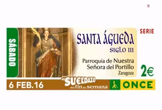 La imagen de Santa Águeda de la Parroquia de Nuestra Señora del Portillo de Zaragoza protagoniza el cupón de la ONCE de este sábado, 6 de febrero. Cinco millones y medio de cupones llevarán a la Patrona de las mujeres por toda España.