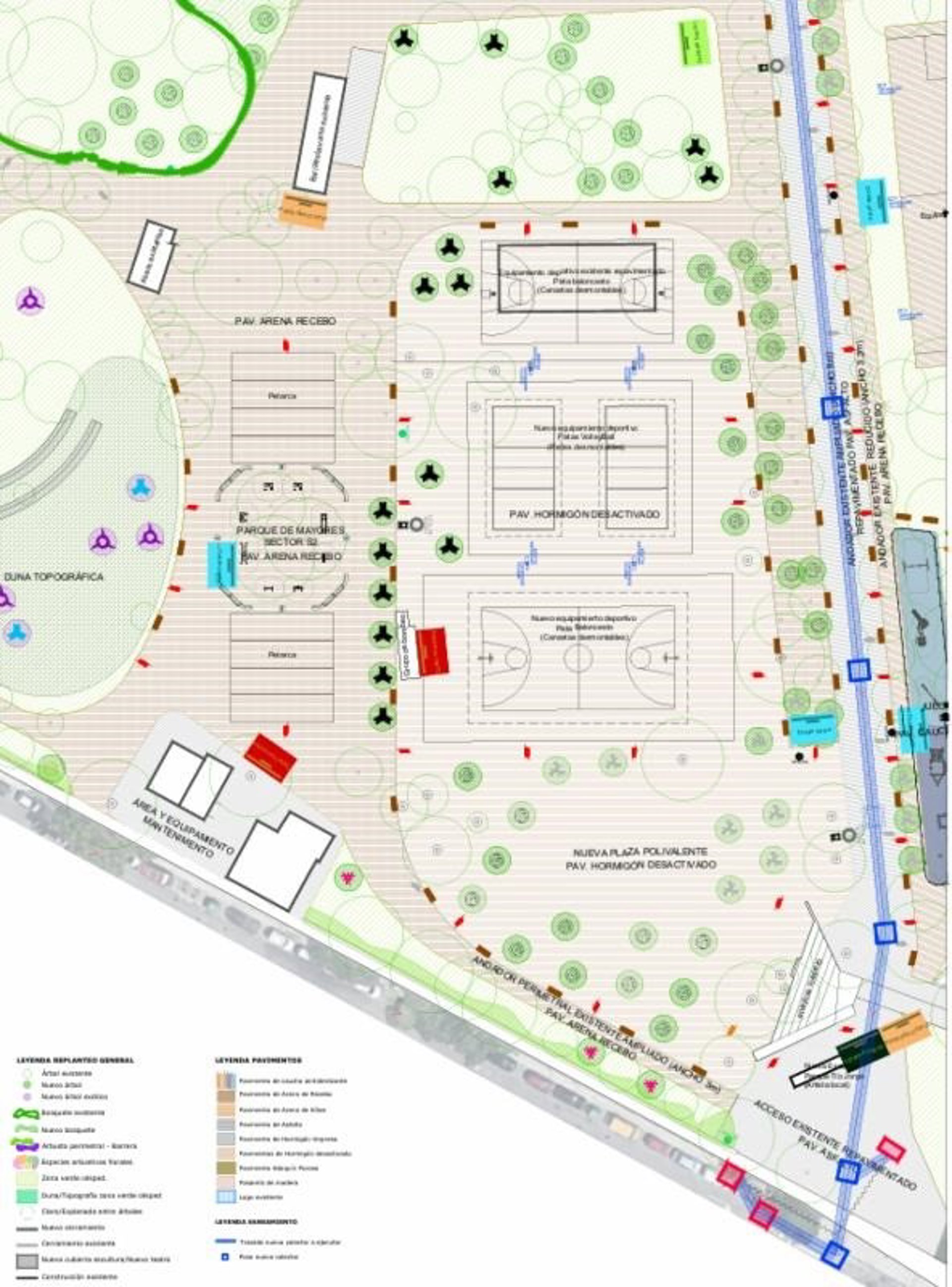 Además, y fruto de las propuestas vecinales, la primera fase de las obras incluirá la reorganización del espacio principal del parque, vinculado al propio bulevar central --a ambos lados de su zona sur--, para crear una plaza polivalente --que se llamará "Cinco de marzo"-- que sirva de espacio para usos diversos, como unas nuevas pistas deportivas y la organización de eventos. También se renovará la zona de juegos infantiles próxima al Centro Cívico Tío Jorge.