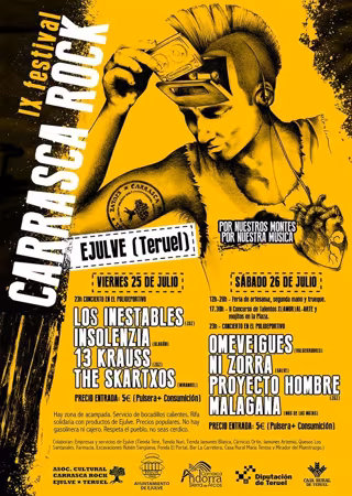 La localidad turolense de Ejulve celebrará los próximos días 25 y 26 de julio la novena edición del 'Festival Carrasca Rock', que parte con los objetivos de promocionar a jóvenes bandas aragonesas y reivindicar el derecho a la cultura en el mundo rural, y que presenta como cabeza de cartel en esta edición las agrupaciones 'Insolenzia', '13 Krauss' y 'Proyecto Hombre'.