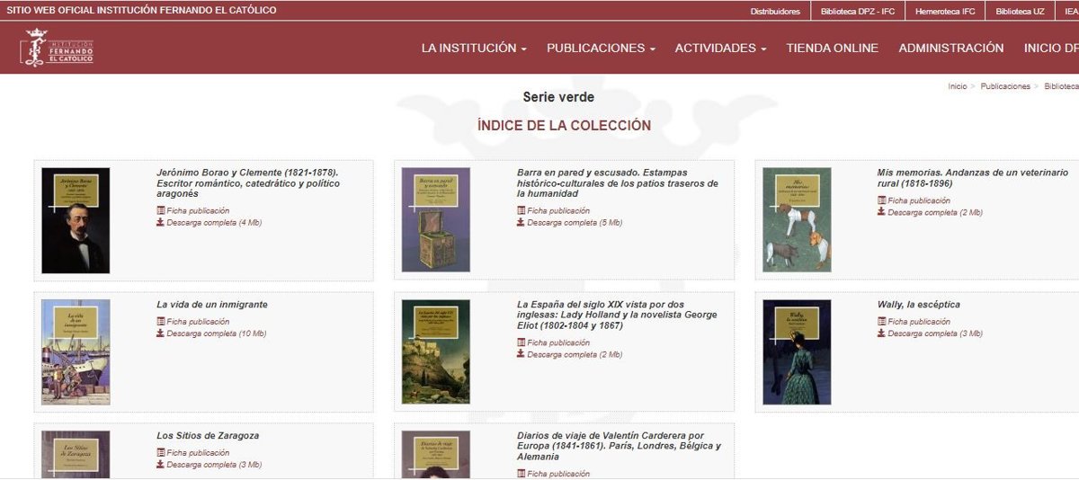 La Institución Fernando el Católico (IFC) de la Diputación de Zaragoza (DPZ) ofrece en su biblioteca virtual 1.350 títulos para su descarga completa, libre y gratuita, lo que supone una tercera parte de la totalidad de los cerca de 3.900 libros publicados por la institución.
