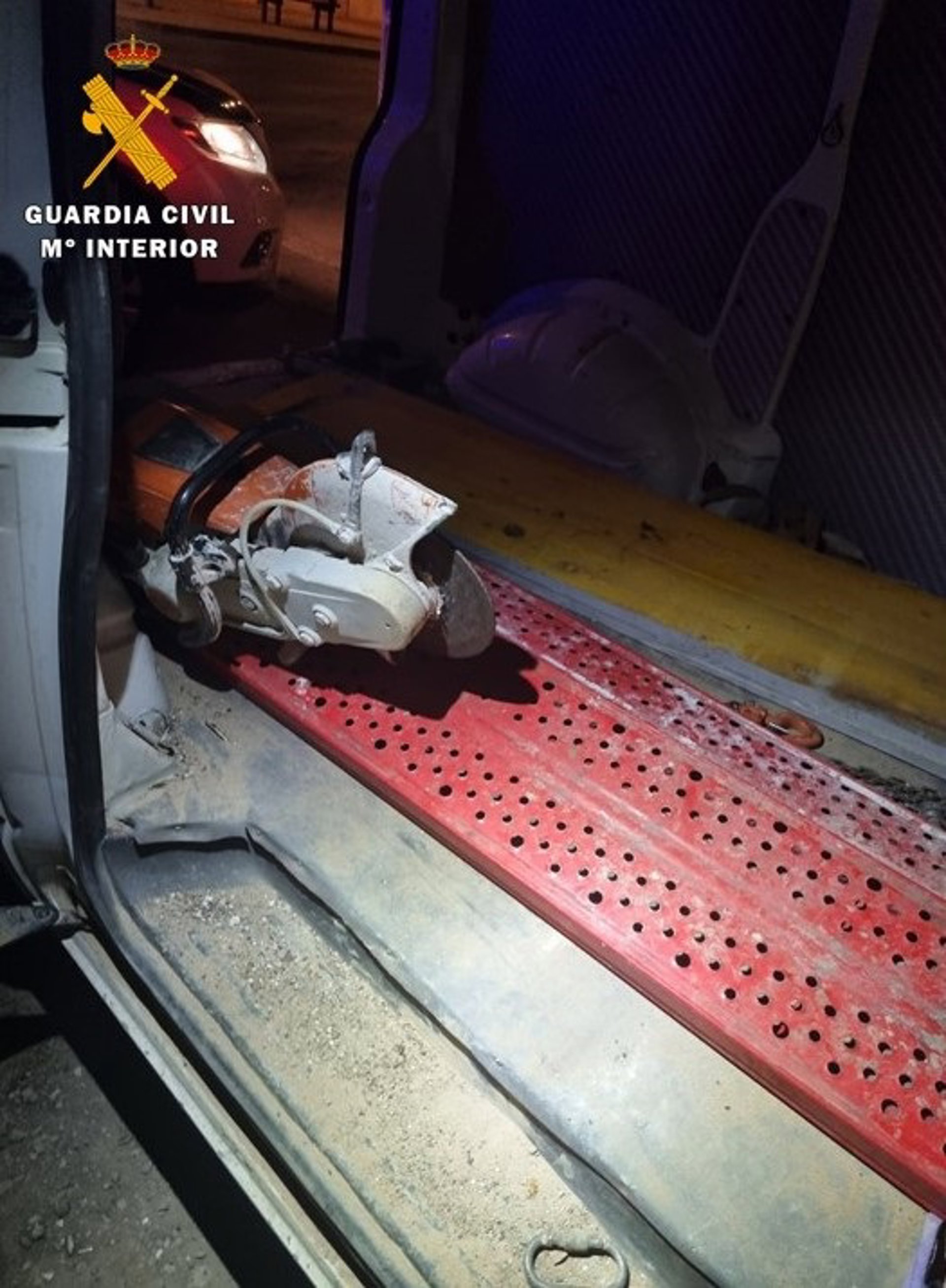 Además, en la parte trasera de la furgoneta se hallaron dos herramientas sobre las que el conductor aportó versiones contradictorias en cuanto a su procedencia, verificando que una de ellas, una sierra radial de combustión, tenía el número de serie borrado intencionadamente. Por tanto, estos utensilios quedaron intervenidos por la Guardia Civil, ante la sospecha de que procediesen de algún ilícito.