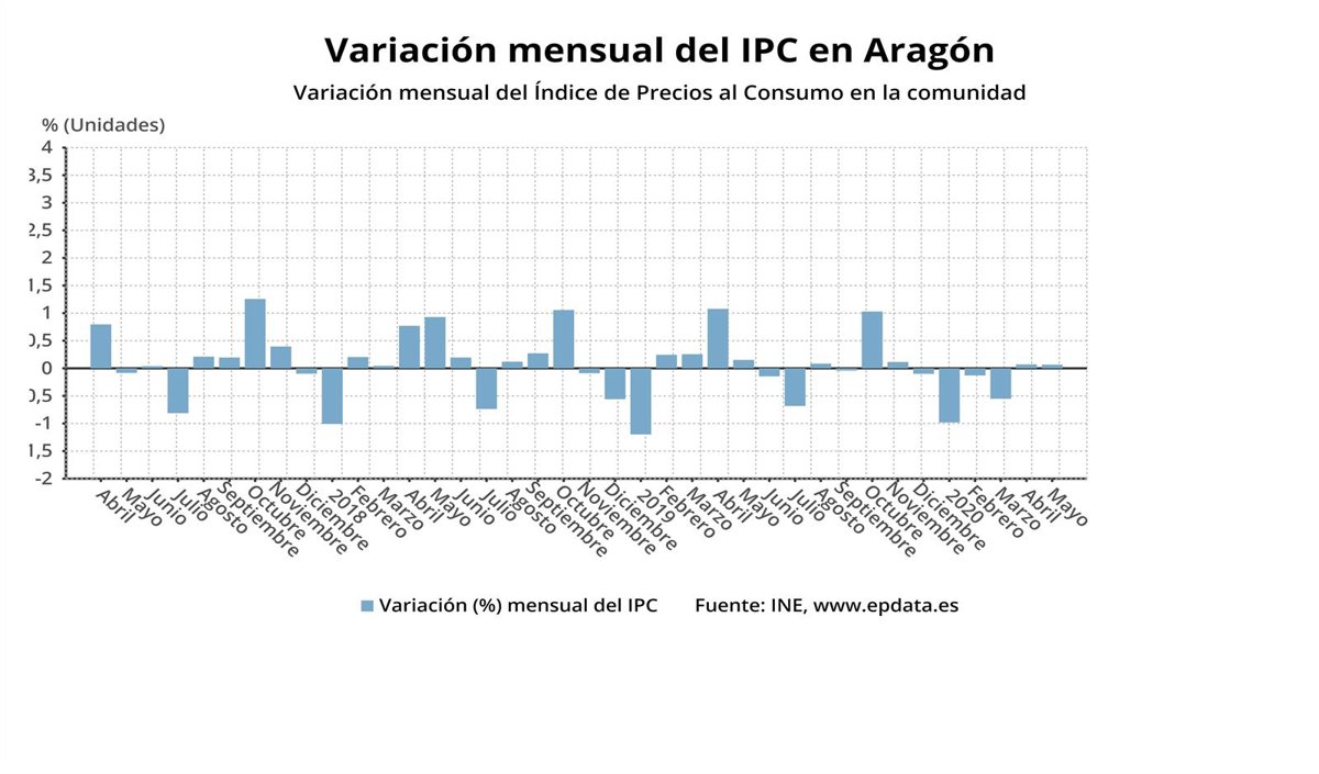 Por provincias aragonesas, la tasa de inflación en mayo de 2020 se situó en un -1,9% anual en el caso de Huesca, un -1,1% anual en Teruel y un -1,2% anual en Zaragoza.