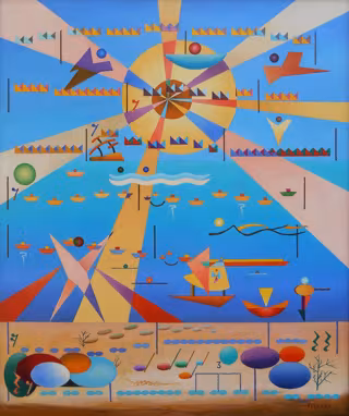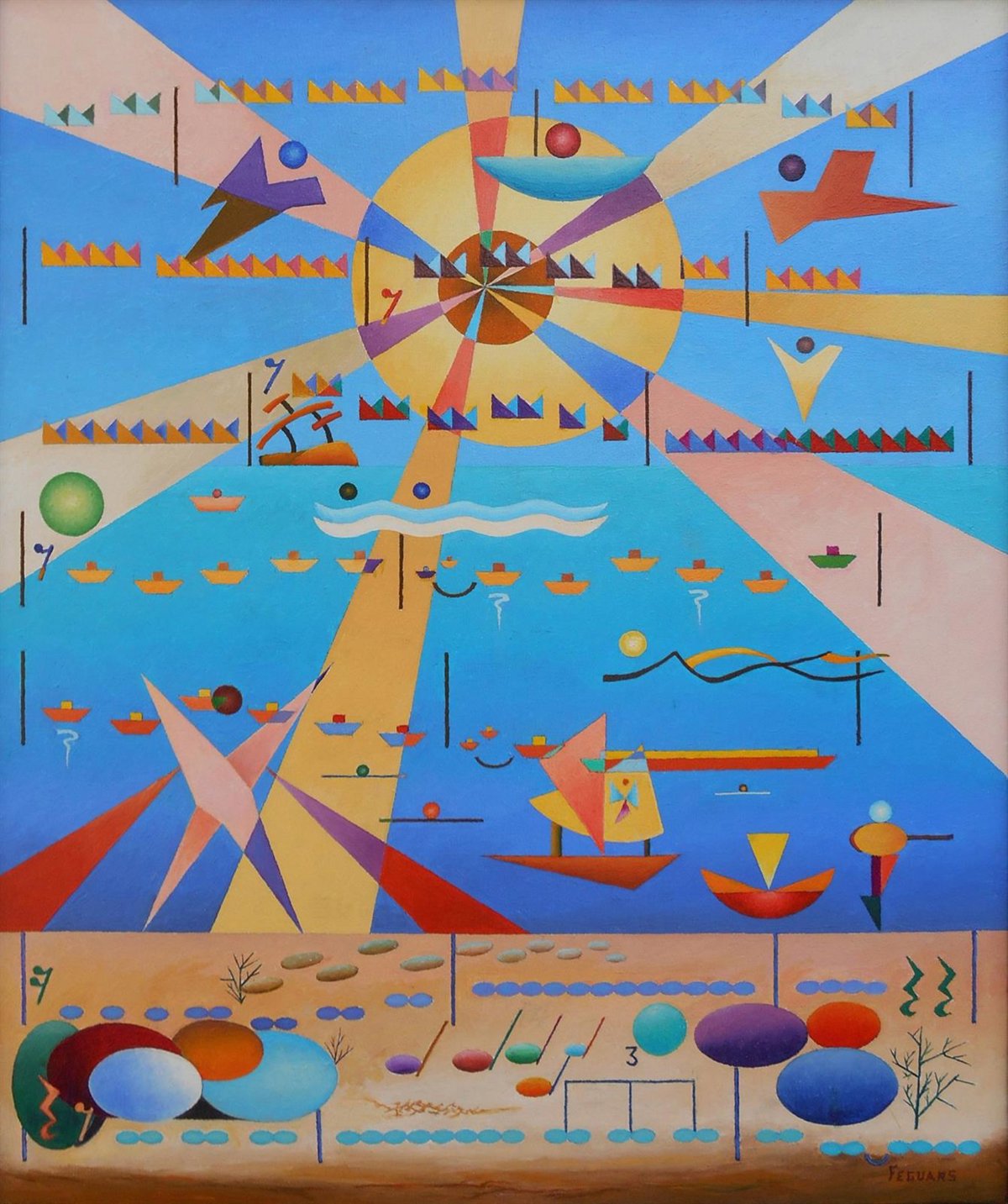 El pintor Joaquín Ferrer Guallar, 'Feguars', (Caspe, 1953) expone desde este martes, 6 de octubre, 36 obras en el centro de Ibercaja Actur, en Zaragoza, bajo el título 'Al buen cantar', realizadas en óleo sobre lienzo, de varios formatos y gran riqueza cromática, en las que predominan las formas geométricas.