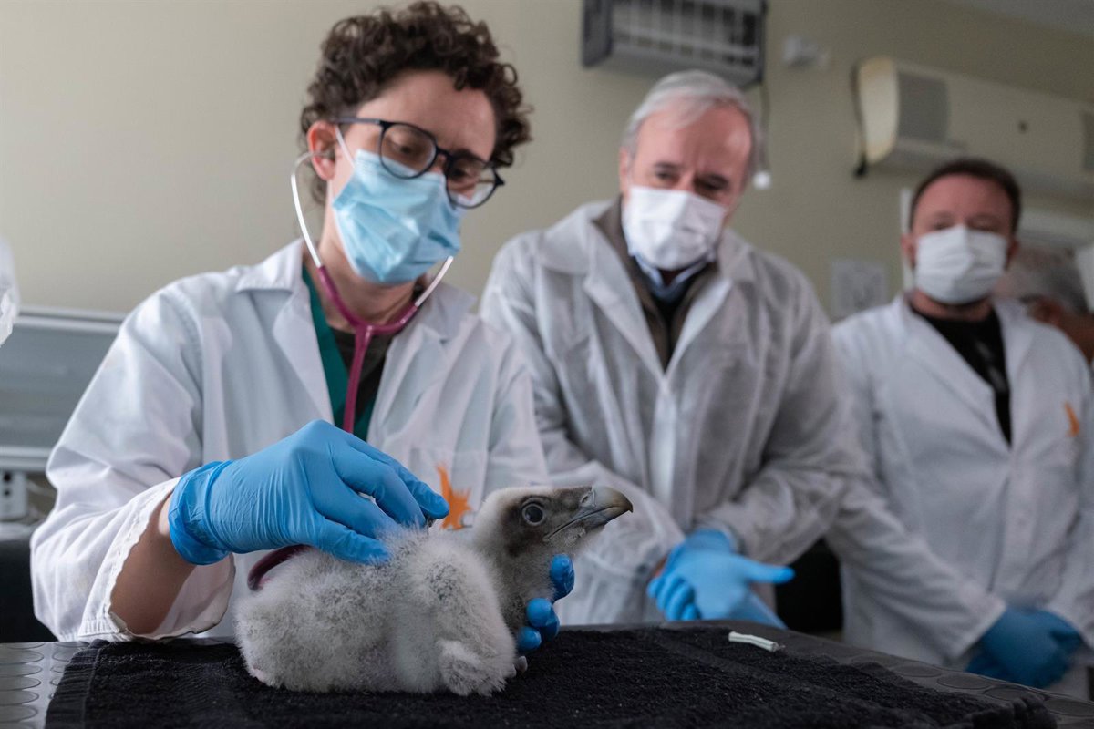 El presidente del Gobierno de Aragón, Jorge Azcón, con un pollo de quebrantahuesos. - FABIÁN SIMÓN.