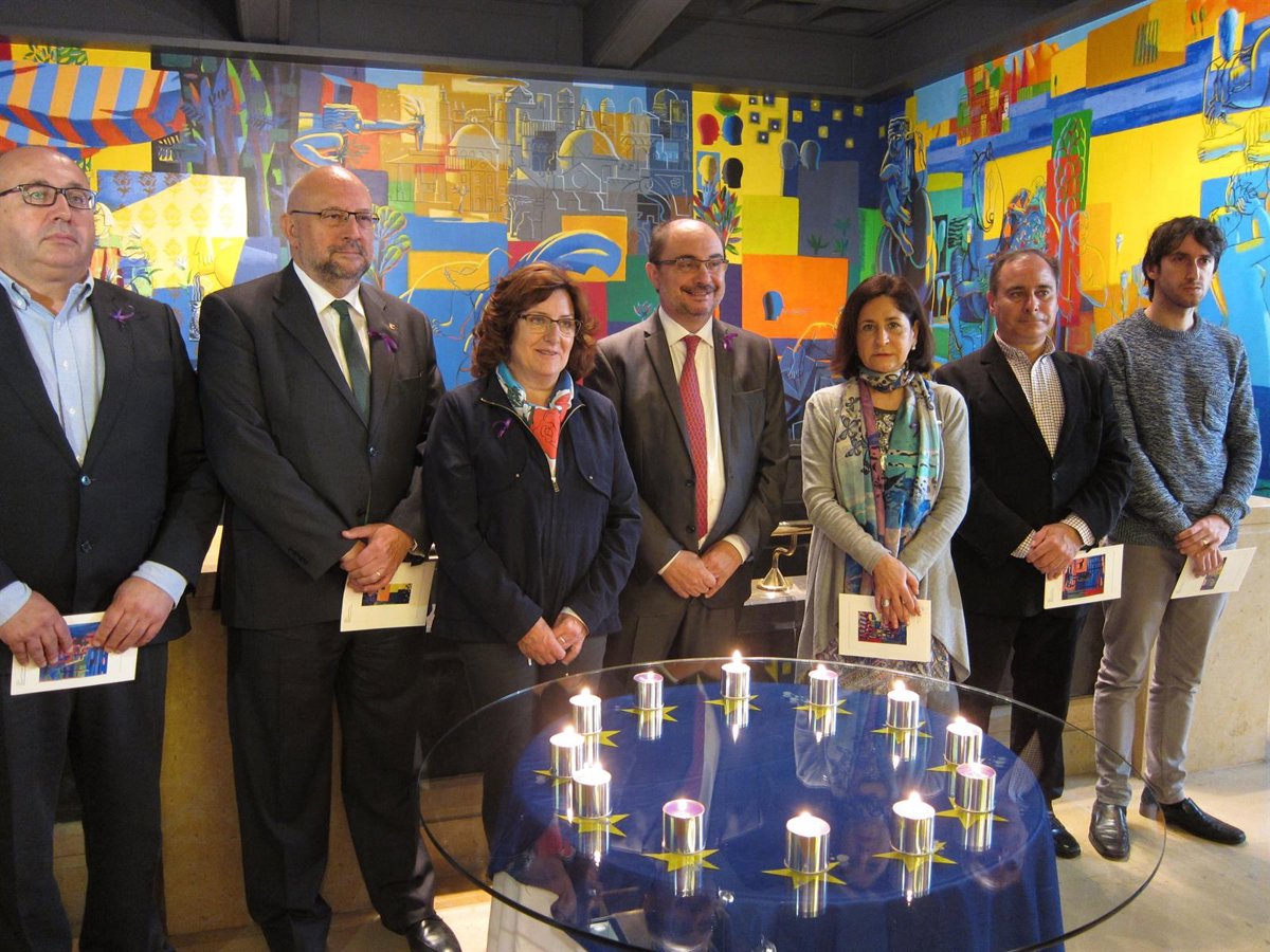 La lectura del manifiesto se ha realizado ante el cuadro de Miguel Gay, 'Aragón, el sueño sostenido y el anhelo armónico', un mural de grandes dimensiones que hace referencia a la construcción europea y, al encender cada vela, los representantes institucionales han mostrado una parte del lienzo, aludiendo a los valores que simboliza.
