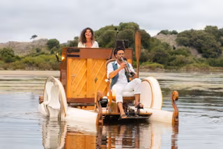 'El pedalOpiano' consta de un piano que descansa sobre dos flotadores catamaranes de un blanco impoluto, ciclopropulsados gracias a dos ruedas-paletas y donde se entremezcla una ecléctica selección musical con la inusual mecánica pianística a pedales.