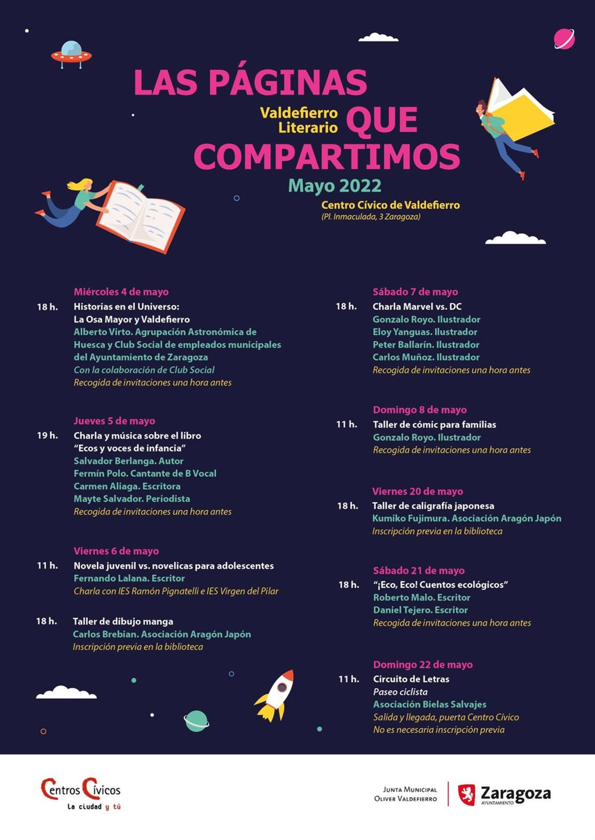 La literatura toma el barrio zaragozano de Valdefierro esta primavera con la celebración de la segunda edición del ciclo cultural 'Las páginas que compartimos'. Tendrá lugar del 4 al 22 de mayo con el centro cívico del barrio como epicentro y con una programación llena de charlas, talleres y cuentacuentos.