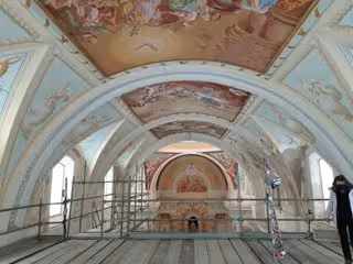 Los equipos de trabajo han comenzado la instalación de los andamios para las labores de restauración de las pinturas murales de Bayeu de la Cartuja de Fuentes, en la localidad oscense de Sariñena, una recuperación artística que se lleva a cabo con financiación de la Diputación de Huesca.