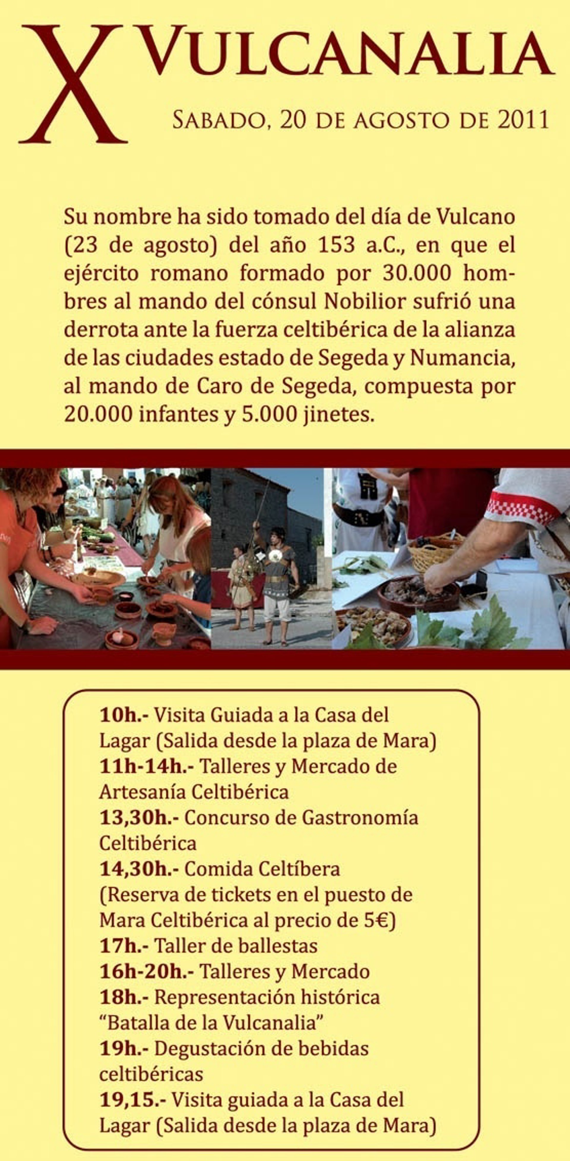 El plato fuerte del día estará protagonizado por romanos y celtíberos en la escenificación de la Batalla de la Vulcanalia, a cargo del grupo de reconstrucción histórica los 'Celtíberos de Segeda'. Se trata de un grupo formado por los arqueólogos que excavan en Segeda y por varios grupos de romanos y aliados, así como un grupo de integrantes de la Asociación Cultural Mara Celtibérica.