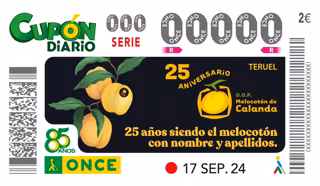 El 25 aniversario de la Denominación de Origen Protegida Melocotón de Calanda es el motivo del cupón de la ONCE del martes, 17 de septiembre. Cinco millones de cupones llevarán por toda España la imagen de esta refrescante fruta turolense.