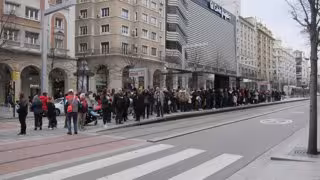 Las menores frecuencias con las que circula el tranvía de Zaragoza este jueves, 8 de marzo, a causa de la huelga feminista convocada en el Día Internacional de la Mujer, hacen que en las paradas se acumule un mayor número de viajeros esperando.