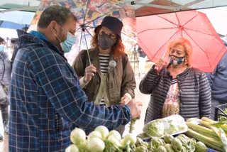 La consejera municipal de Economía, Innovación y Empleodel Ayuntamiento de Zaragoza, Carmen Herrarte, en un puesto de hortalizas del mercado ambulante de La Almozara. - DANIEL PÉREZ - AYUNTAMIENTO DE ZARAGOZA