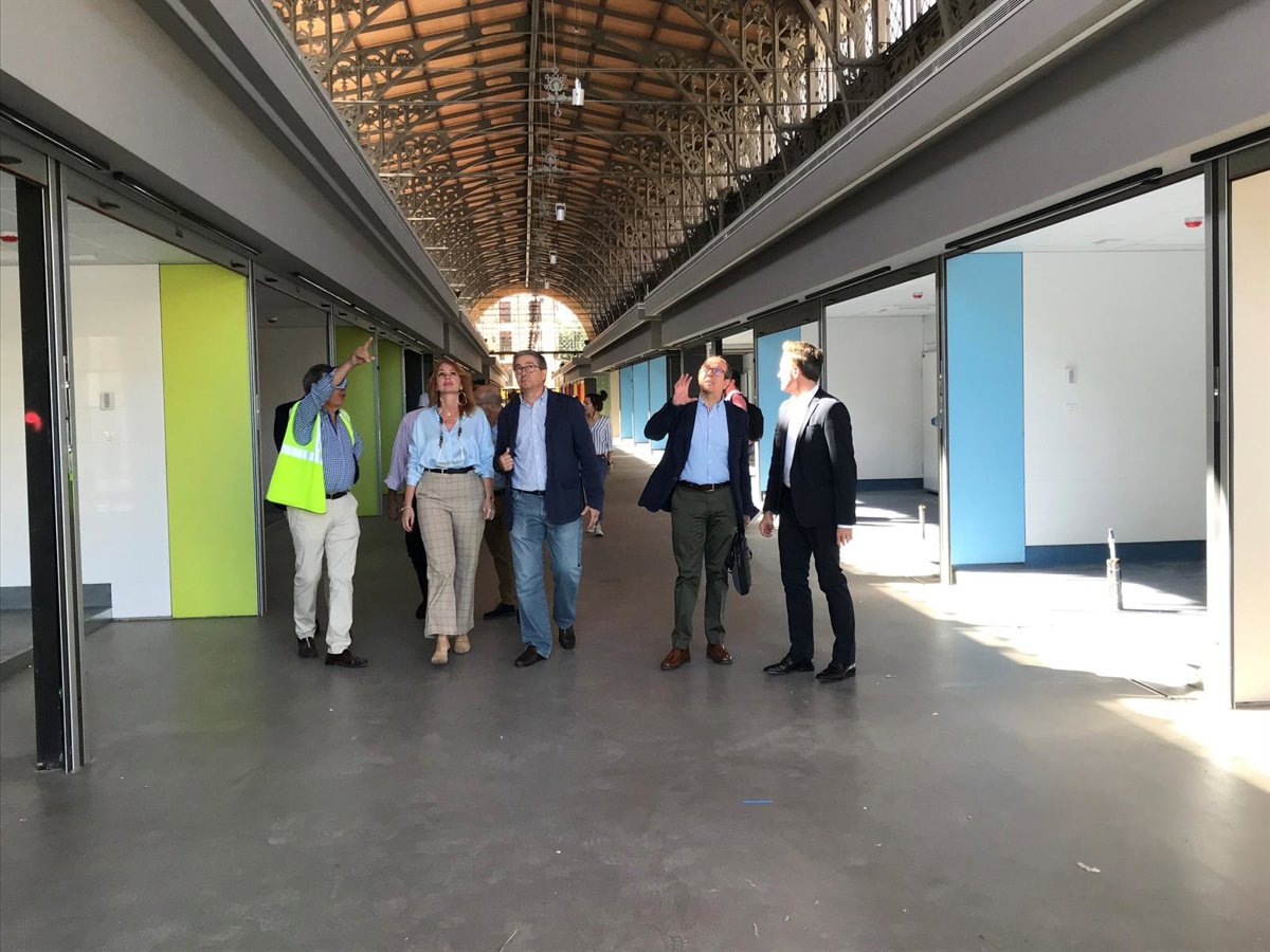 El consejero municipal de Urbanismo y Equipamientos, Víctor Serrano; y la consejera municipal de Economía, Innovación y Empleo, Carmen Herrarte, junto al presidente de la Asociación de Detallistas del Mercado Central, José Carlos Gran, han visitado la instalación que ya está reformada a falta de montar los puestos.