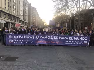 Miles de feministas se han manifestado este viernes, 8 de marzo, en la capital aragonesa con el lema 'Si nosotras paramos, se para el mundo', convocadas por la Asamblea 8M Zaragoza, llenando las principales vías del centro, desde la Granvía, el Paseo Pamplona y el Paseo Sagasta por el Paseo de la Independencia hasta la plaza del Pilar, donde se ha dado lectura a un manifiesto.