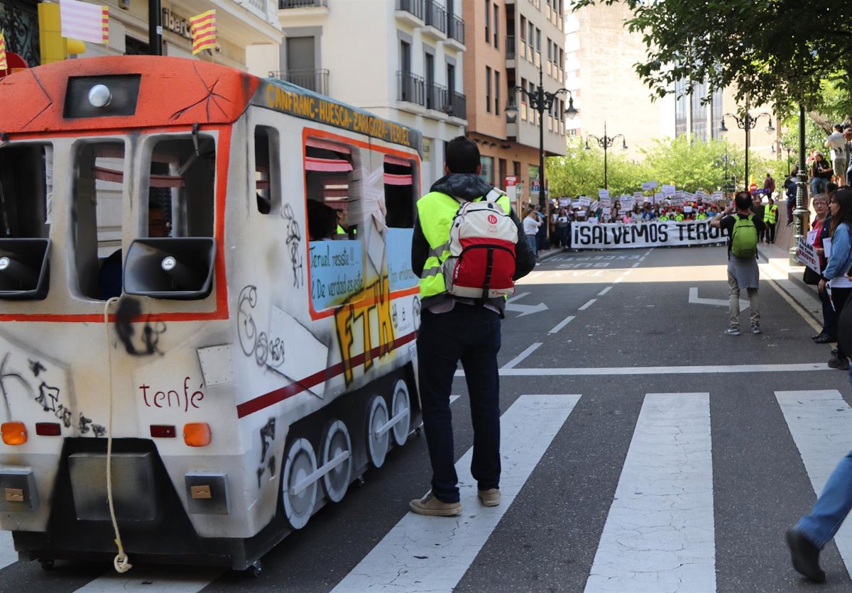 La movilización ha empezado en el Edificio Pignatelli, sede del Ejecutivo autonómico, y ha llegado hasta la puerta de la Delegación del Gobierno en Aragón. Ha estado encabezada por la escultura de un tren creada por el artista fallero Luis Pascual, con la que los participantes han reclamado mejoras en el servicio ferroviario de viajeros.
