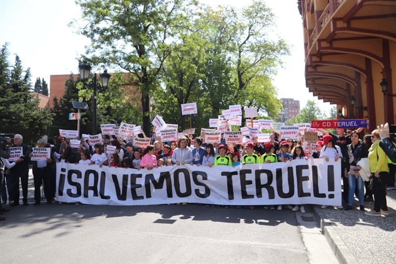 Detrás de este tren, un grupo de niños ha llevado la pancarta principal de la manifestación con el lema 'Salvemos Teruel'. El portavoz de la plataforma 'Teruel Existe', Manuel Gimeno, ha explicado que se ha elegido a niños para llevarla porque son "el futuro de la provincia" y "no llevan ninguna consigna de ningún partido político ni de ningún grupo".