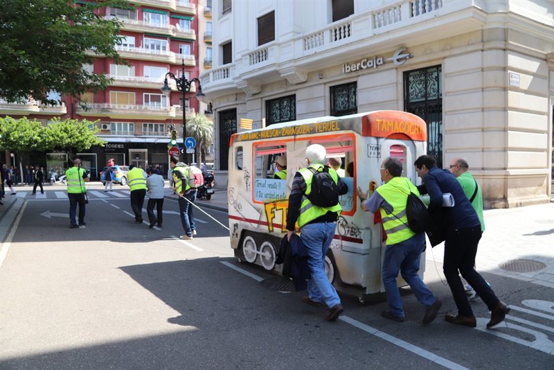 La movilización ha empezado en el Edificio Pignatelli, sede del Ejecutivo autonómico, y ha llegado hasta la puerta de la Delegación del Gobierno en Aragón. Ha estado encabezada por la escultura de un tren creada por el artista fallero Luis Pascual, con la que los participantes han reclamado mejoras en el servicio ferroviario de viajeros.