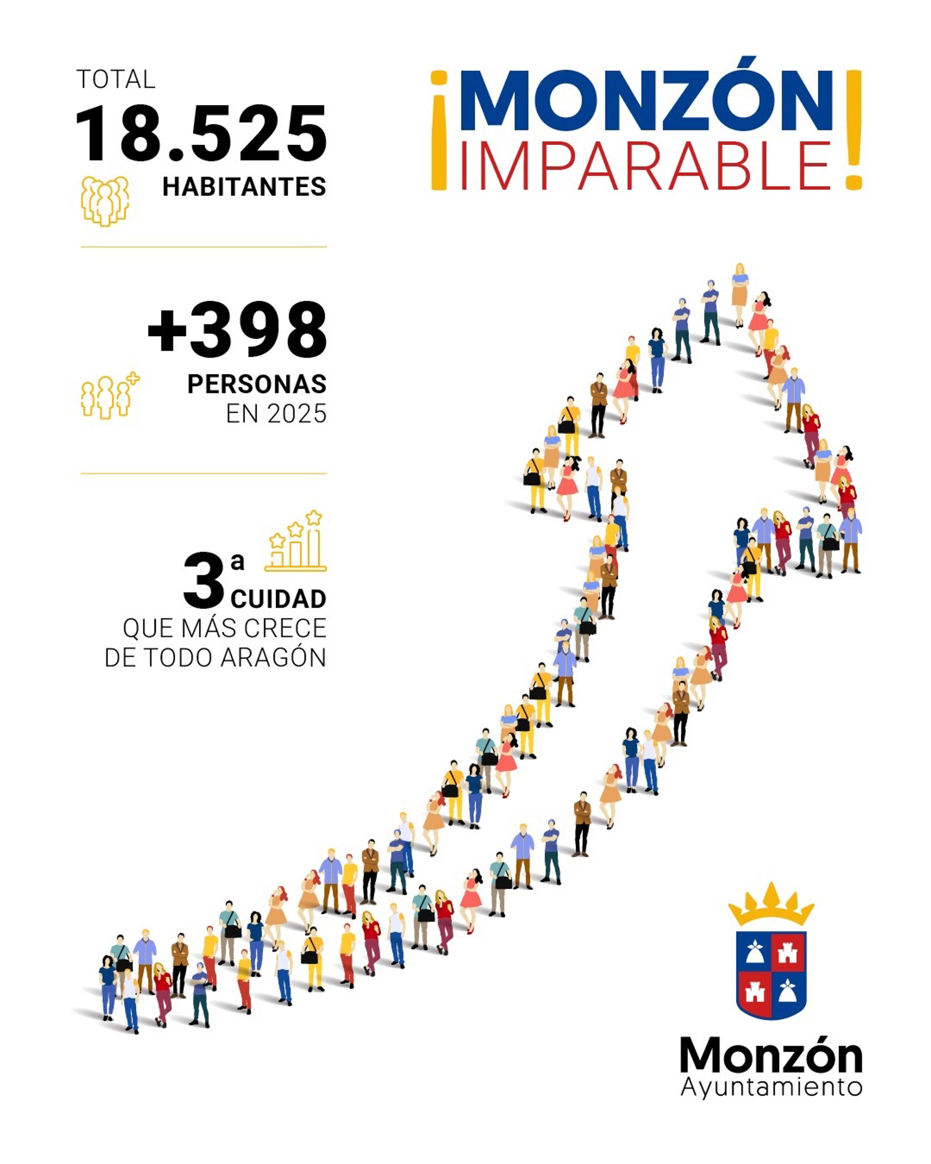 El Instituto Nacional de Estadística (INE) ha publicado los datos definitivos del padrón de habitantes correspondientes a 1 de enero de 2025, que sitúan a Monzón, con 18.525 habitantes, como la tercera localidad que más ha crecido en Aragón, tras Zaragoza y Huesca, manteniéndose con holgura como la segunda ciudad de la provincia de Huesca.