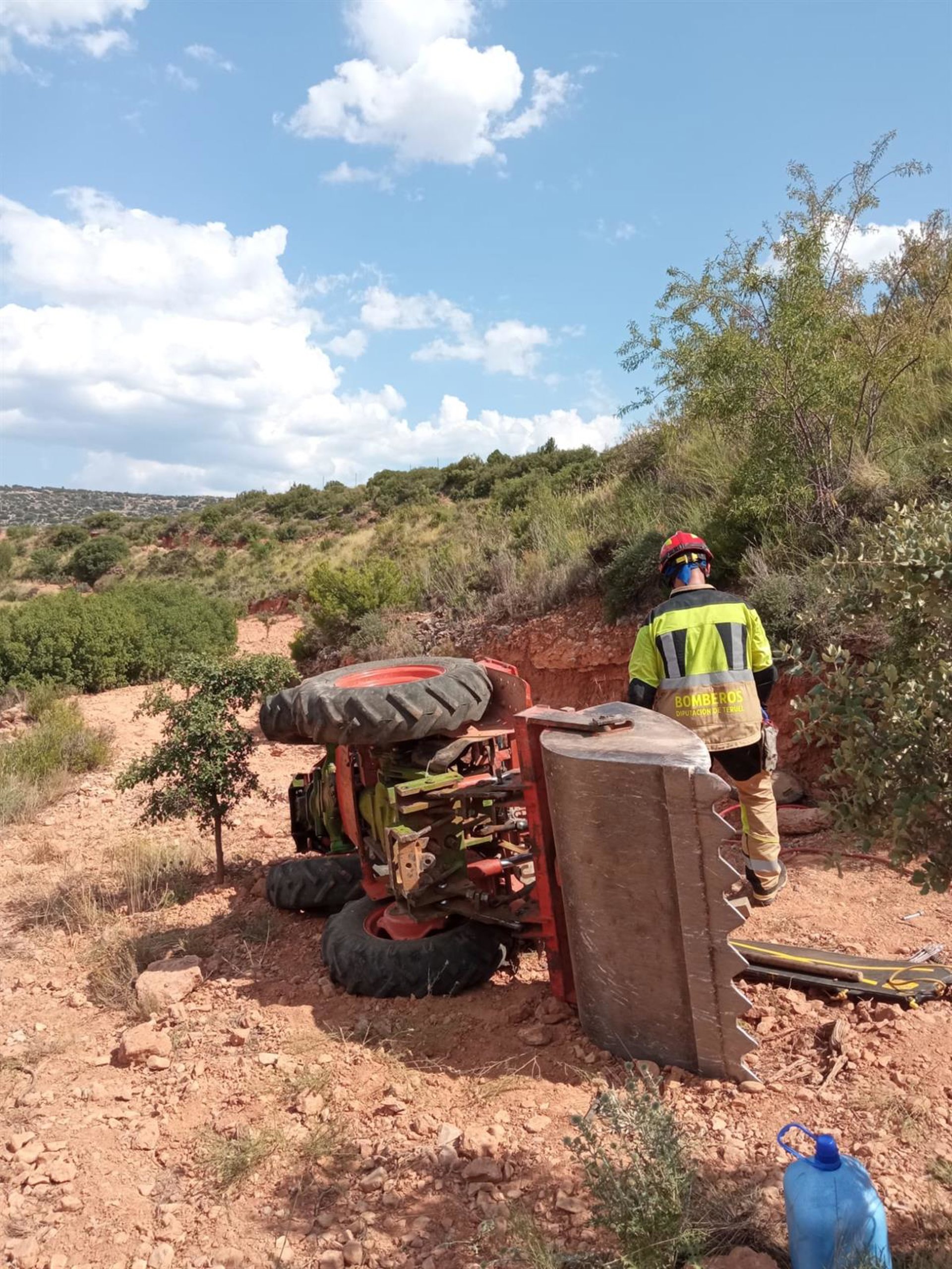 Tras recibir aviso del accidente, en el lugar se personaron agentes de la Guardia Civil, servicios sanitarios y Bomberos de la Diputación de Teruel, que desplazaron dos vehículos con cuatro bomberos y un oficial. Pero al llegar, encontraron al hombre ya fallecido, por lo que los bomberos se ocuparon de excarcelar su cadáver del vehículo agrícola en el que había quedado atrapado.