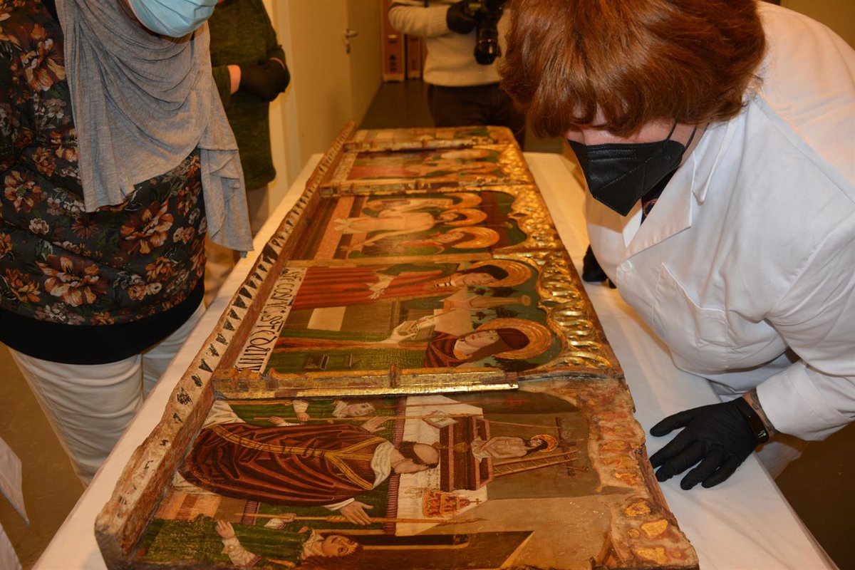La semana pasada se desembalaron las 42 piezas recibidas el 5 de marzo, que por su volumen se acometió en dos jornadas. Por un lado, las pinturas sobre tabla y tejido, con la presencia de la directora general de Patrimonio, Marisancho Menjón. Por otro, los textiles, procedentes en su mayoría de Roda de Isábena, con la participación de