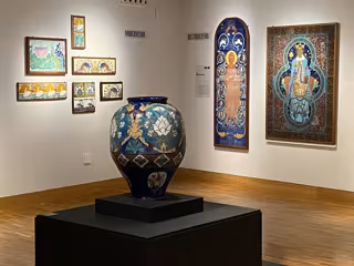La muestra incluye piezas de gran vistosidad y dimensión, también dibujos, acuarelas y óleos íntimos, que representan todas las etapas de la actividad creadora del artista, desde la fábrica de La Moncloa, en Madrid (1877-1892) pasando por la fábrica de loza La Segoviana, en Segovia (1893-1906), hasta su taller como ceramista independiente en la iglesia románica desamortizada de San Juan de los Caballeros (1907-1921).
