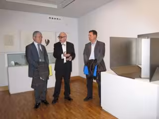 El consejero municipal de Cultura del consistorio, Jerónimo Blasco, el director regional de Banca Patrimonial de Banca March, José María Dehesa, y el comisario Javier Maderuelo han presentado este jueves en rueda de prensa esta muestra que "no es una exposición más de Pablo Palazuelo, sino una pequeña exposición de gabinete, temática, sobre los procesos de creación escultórica del artista", ha subrayado Maderuelo.