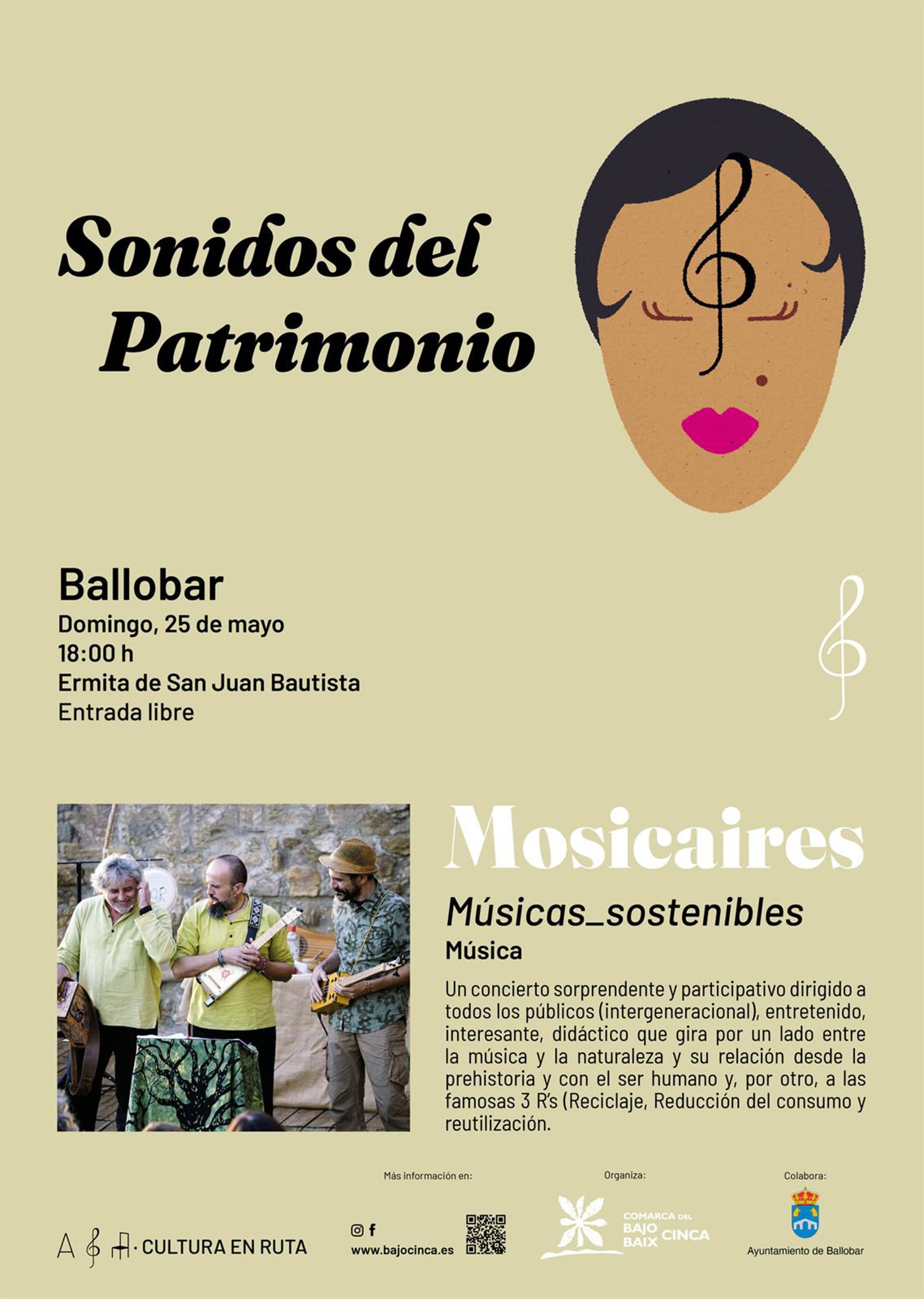 El ciclo arranca el domingo 25 de mayo en Ballobar, con la actuación de Mosicaires en la Ermita de San Juan Bautista --18.00 horas--, un espectáculo participativo y didáctico que aúna tradición musical, valores sostenibles y conexión con el medio ambiente. Es un concierto pensado para emocionar, compartir y disfrutar en familia.