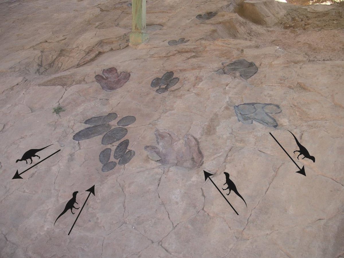 La mayoría de los dinosaurios carnívoros se movían aproximadamente paralelos entre sí, pero con diferentes sentidos. Esta orientación es, además, similar a la de las ondas dejadas por el oleaje, por lo que estos dinosaurios caminaban posiblemente paralelos a la orilla de la laguna. Por el contrario, el dinosaurio ornitópodo caminaba perpendicular a estos.