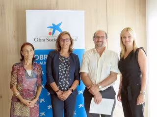 La presidenta comité autonómico Cruz Roja Aragón, Pilar Cintora, el presidente del comité provincial de Teruel, Antonio Soler, la directora territorial de CaixaBank en Aragón y La Rioja, Cristina González, y la directora área negocio CaixaBank en Bajo Aragon, Nati Asin, han rubricado la firma del convenio en la sede de dirección territorial CaixaBank, en Zaragoza.