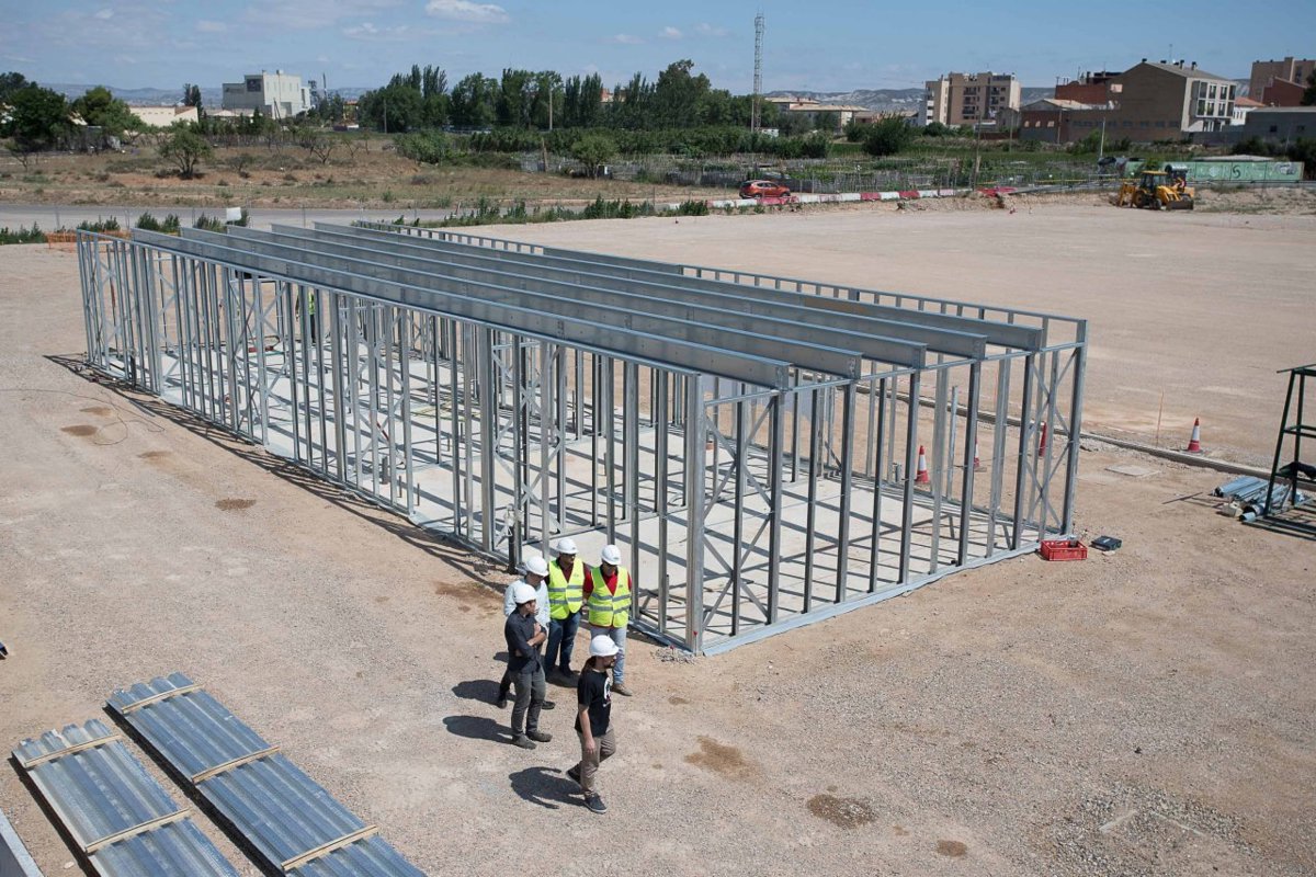 Las obras del nuevo Campo Municipal de Fútbol de Casetas avanzan a buen ritmo, con el horizonte de ser inaugurado en el mes de octubre y tras una inversión de 940.000 euros. El concejal de Vivienda y Deporte, Pablo Híjar, y el consejero municipal de Urbanismo del Ayuntamiento de Zaragoza, Pablo Muñoz, han realizado una visita junto al arquitecto municipal José Javier Gallardo y el presidente de la UD Casetas, Cecilio García, en la que han conocido en detalle la nueva estructura del edificio de vestuarios que se acaba de instalar.