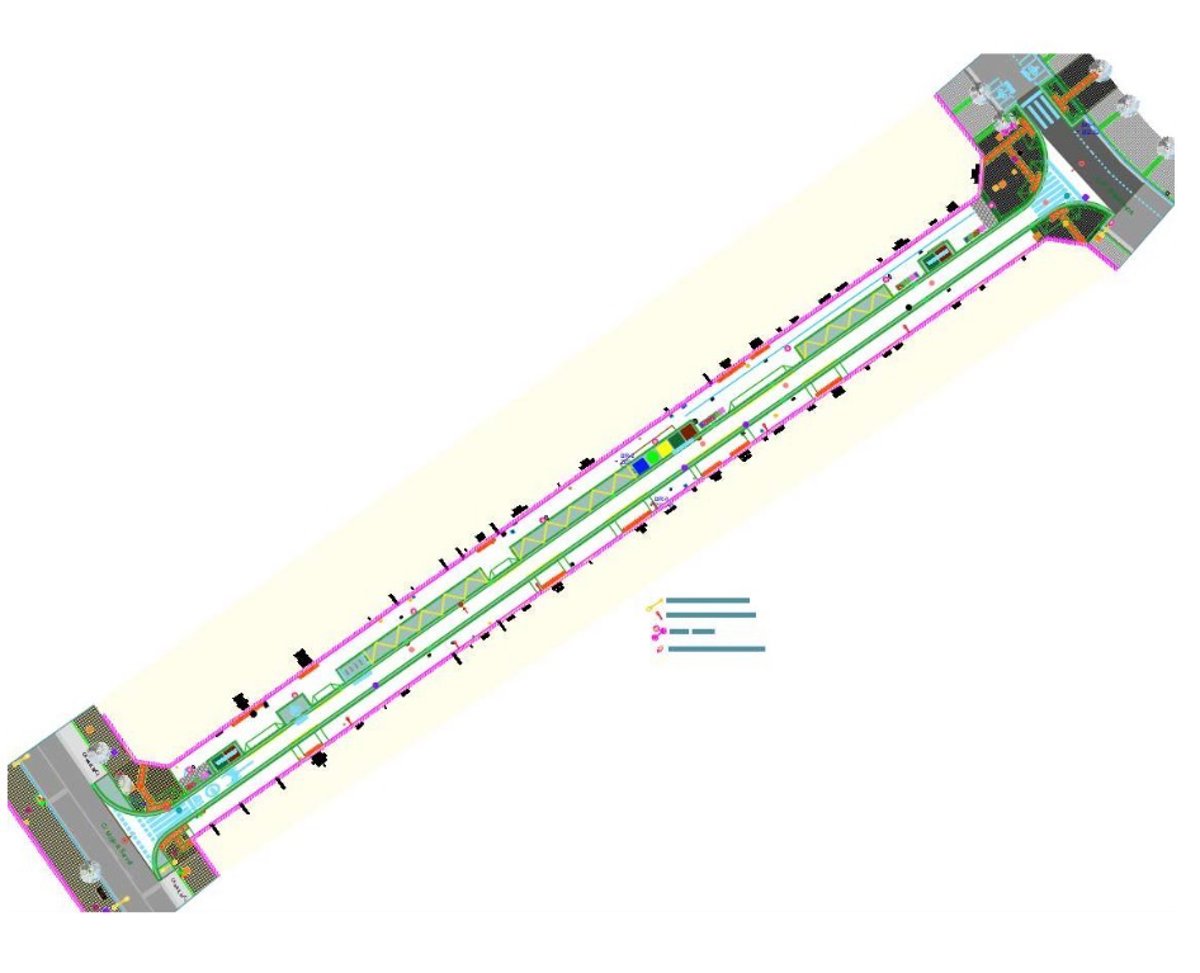 La calzada y las aceras, por su parte, se proyectan a distinto nivel por seguridad debido al tráfico rodado que hace uso de la calle. Se propone trasladar al lado de los impares el estacionamiento y la reserva de carga y descarga y se genera una zona de aparcamiento para motos, bicis y VMPs.