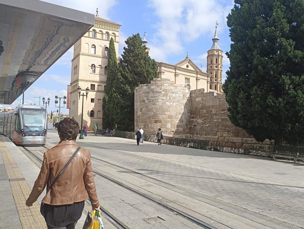 Una usuaria observa este sábado 11 de octubre la partida del tranvía de la parada de Murallas en sentido hacia el barrio del Actur. - EUROPA PRESS