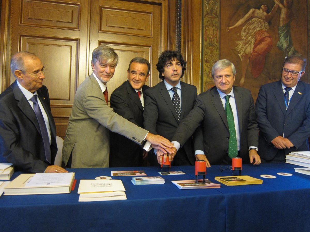 El subsecretario de Fomento en funciones, Mario Garcés, el presidente de la DPZ, Juan Antonio Sánchez Quero, el alcalde de Zaragoza, Pedro Santisteve, el presidente de Correos, Javier Cuesta, y los máximos responsables de la Federación Española de Sociedades Filatélicas (FESOFI), Miguel Ángel García, y de la Asociación Española de Empresarios de Filatelia y Numismática (ANFIL), Mario Mirman, han asistido a la presentación de las actividades que se llevarán a cabo en la ciudad esta semana y han dado a conocer los nuevos sellos dedicados a Exfilna, a los 300 años de Correos y al 500 aniversario del fallecimiento de Fernando el Católico.