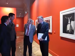 El presidente de la Diputación Provincial de Zaragoza (DPZ), Luis María Beamonte, el diputado delegado de Cultura de la institución, José Manuel Larqué, el director de la Fundación Picasso-Museo Casa Natal, José María Luna, y el galerista y propietario de parte de las piezas expuestas, Antonio de Suñer, han presentado en rueda de prensa esta muestra que podrá visitarse hasta el 4 de mayo.