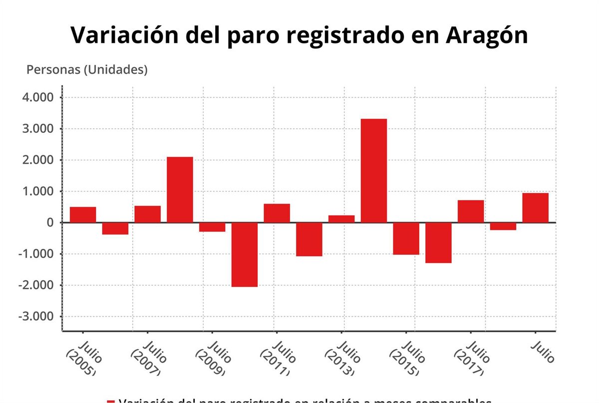 El número de parados registrados en Aragón ha aumentado en el mes de julio en 946 personas, lo que supone una subida de un 1,59 por ciento respecto al mes anterior, según los datos facilitados este viernes por el Ministerio de Trabajo, Migraciones y Seguridad Social. Así, el número de desempleados en la comunidad aragonesa asciende a 60.454.