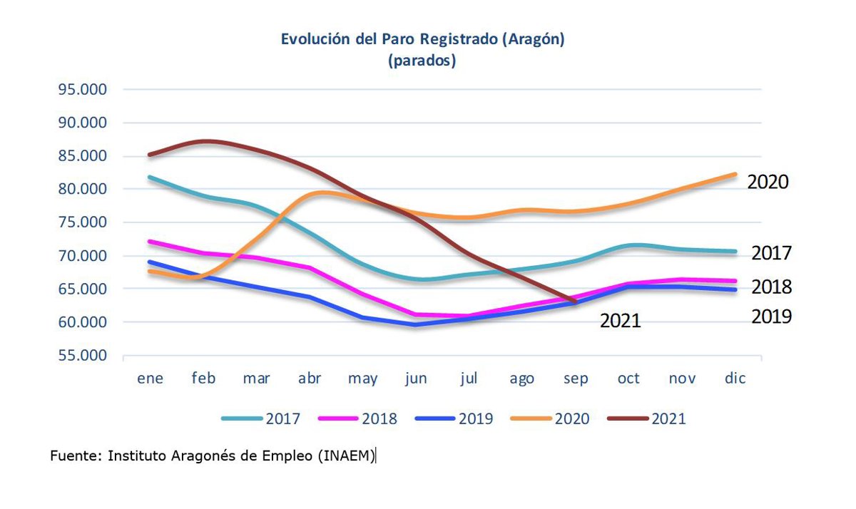 En comparación con septiembre de 2020, el paro en Aragón ha disminuido en septiembre de 2021 en 13.561 personas, lo que supone una fuerte caída del 17,68 por ciento en tasa anual.