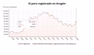 El paro registrado en Aragón en comparación con mayo de 2019 ha aumentado en 17.798 personas, lo que supone un incremento del 29,31 por ciento en tasa anual. Por su parte, en el conjunto de España, el número de desempleados ha subido en 778.285 personas respecto al mismo mes del año anterior, el 25,27 por ciento.