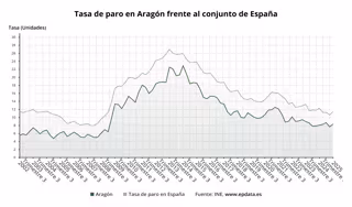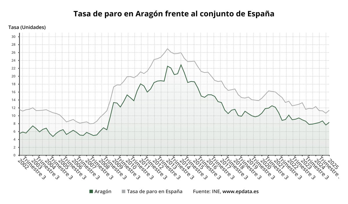 Esta cifra de parados es la más alta en un primer trimestre desde 2023. Desde el inicio de la serie del INE, el paro ha subido en el primer trimestre la mayoría de veces en Aragón (17 veces) mientras que ha bajado en 6 ocasiones, siendo el repunte del último trimestre la menor subida desde 2020.