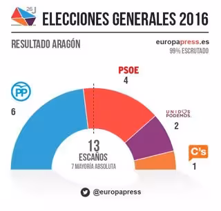 Los partidos han repetido en Aragón resultados en el Congreso y en el Senado respecto a las elecciones generales del 20 de diciembre de 2015. En el Congreso, de los 13 escaños, 6 han sido para PP-PAR, 4 para el PSOE, 2 para Unidos Podeños y 1 para Ciudadanos (C's).