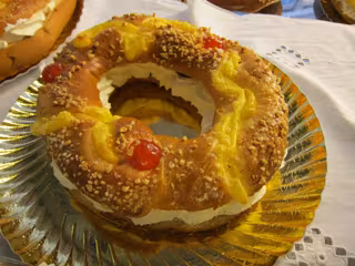 La receta del roscón de San Valero es la misma que el de Reyes y los ingredientes son harina, agua, huevos, anís, agua de azahar, naranja, limón, "buena mantequilla" y el relleno "de excelente nata natural, que es lo principal", ha remachado.