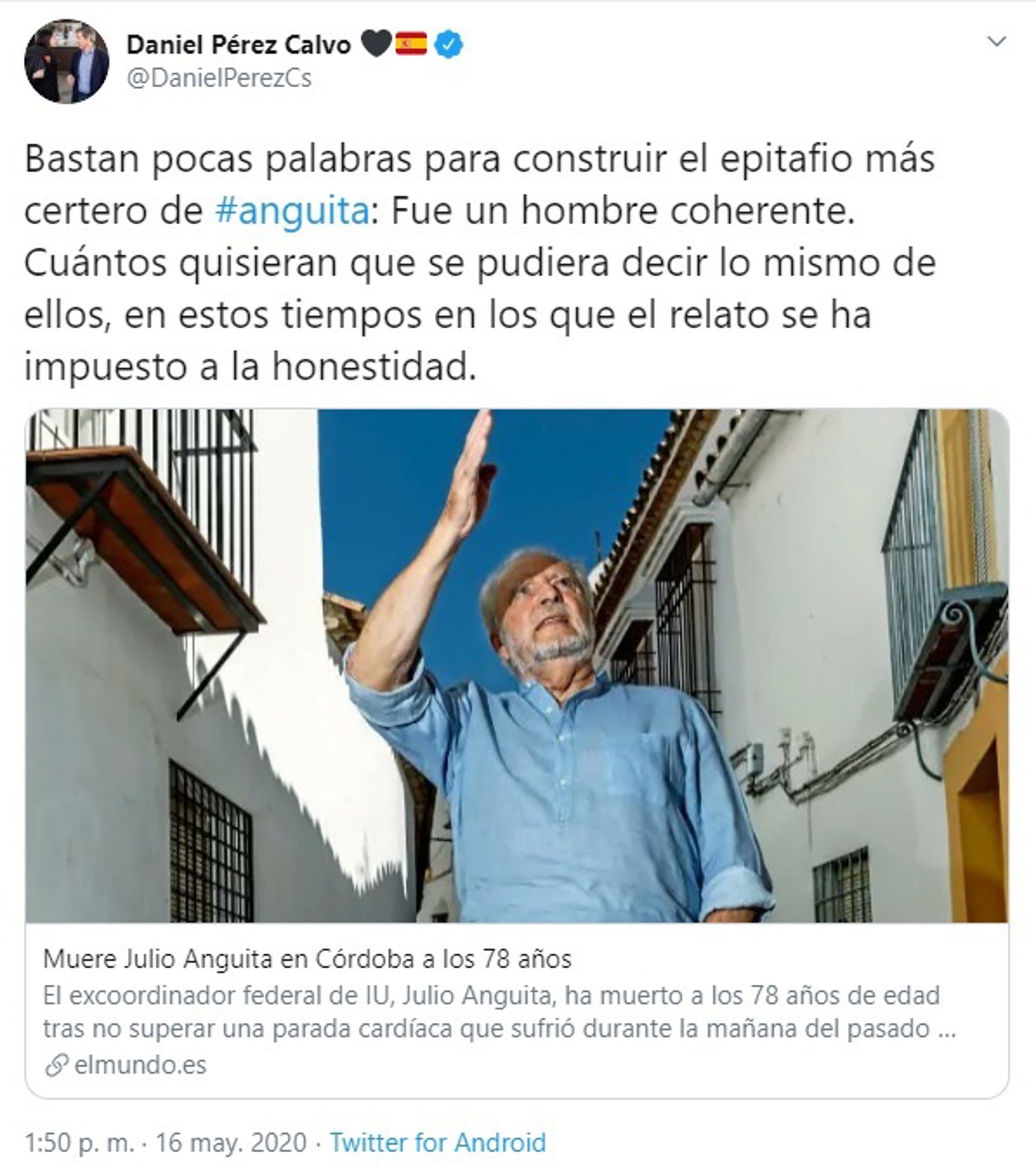 "Bastan pocas palabras para construir el epitafio más certero de #anguita: Fue un hombre coherente. Cuántos quisieran que se pudiera decir lo mismo de ellos, en estos tiempos en los que el relato se ha impuesto a la honestidad", ha publicado Pérez Calvo en la red social Twitter.