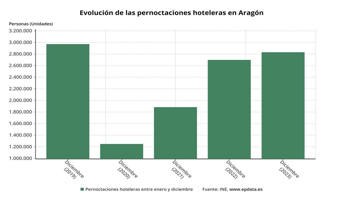 Las pernoctaciones en establecimientos hoteleros en Aragón han aumentado un 1,43 por ciento en diciembre de 2023 en comparación con el mismo mes del año anterior hasta sumar un total de 381.497 pernoctaciones y encadena 3 meses de crecimiento, según los datos publicados por el Instituto Nacional de Estadística (INE). Se trata del tercer mejor dato de pernoctaciones en un mes de diciembre en la región de la serie histórica.