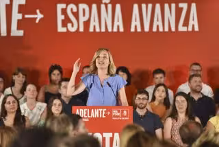 Según la candidata, "las opciones están muy claras, apostar por esa España que mira hacia adelante, avanza o progresa o la opción de la España que solo quiere apretar el botón del pasado, de la mano de Feijóo y Santiago Abascal --líder de VOX--, donde solo caben los que piensan como ellos".