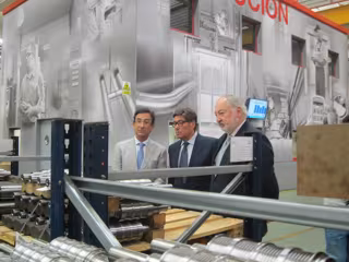 El director de la fábrica de Zaragoza, Ángel García, y el director general de Schindler en España, Carlos Guembe, han mostrado este lunes al consejero de Industria e Innovación, Arturo Aliaga, la planta zaragozana y la nueva máquina.