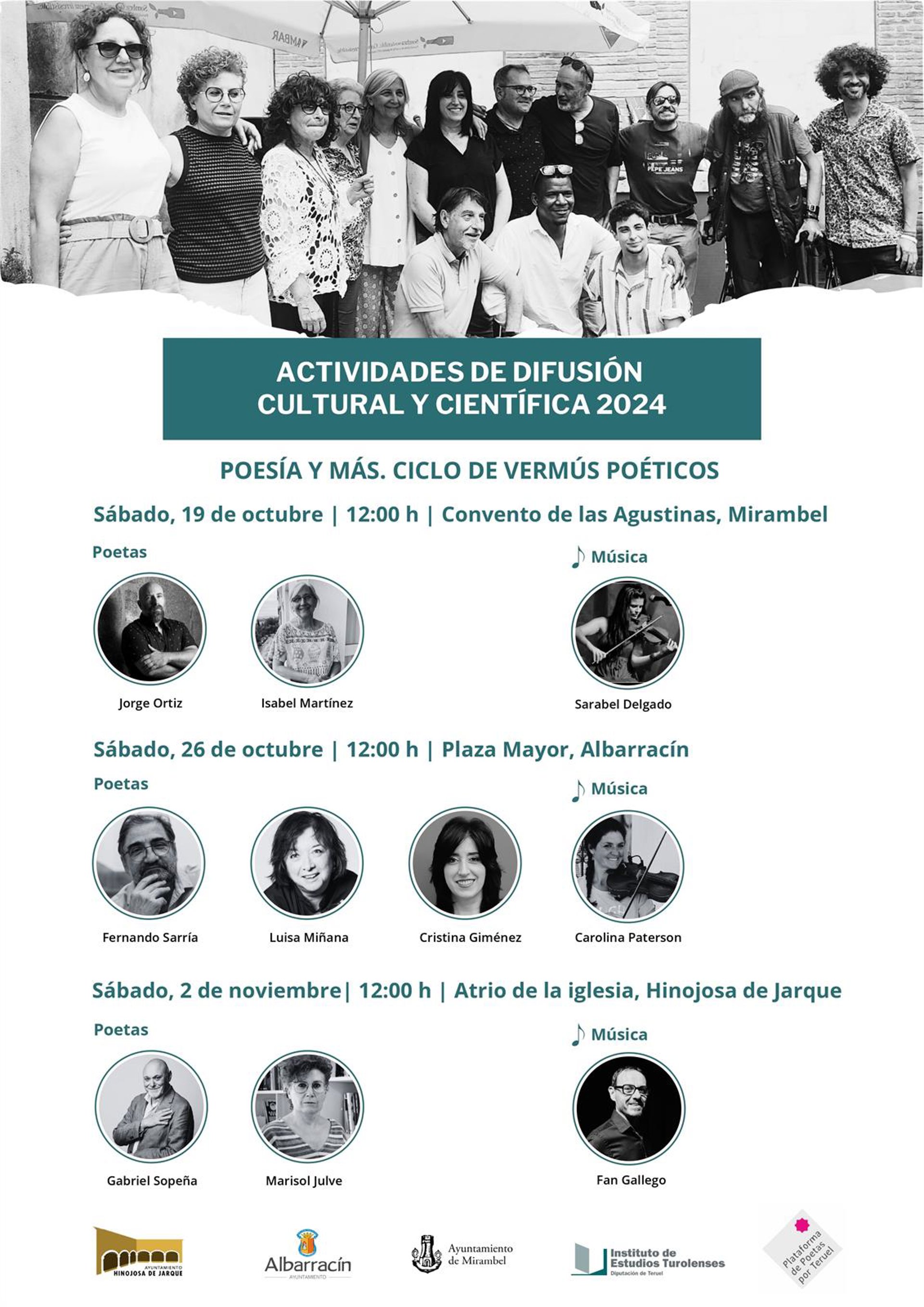 La Plataforma de Poetas por Teruel promueve tres 'Vermús poéticos' en Mirambel, Albarracín e Hinojosa de Jarque durante los meses de octubre y noviembre, una iniciativa propuesta bajo el nombre 'Poesía y más', que cuenta con el patrocinio del Instituto de Estudios Turolenses (IET) de la Diputación de Teruel.