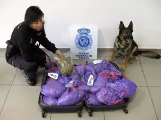 Tras solicitar la colaboración de la Unidad de Guías Caninos, un perro especialista en la detección de sustancias estupefacientes ha "marcado" claramente una maleta, en cuyo interior han encontrado veinte bolsas de plástico, conteniendo cada una de ellas una cantidad aproximada de 200 gramos de marihuana.