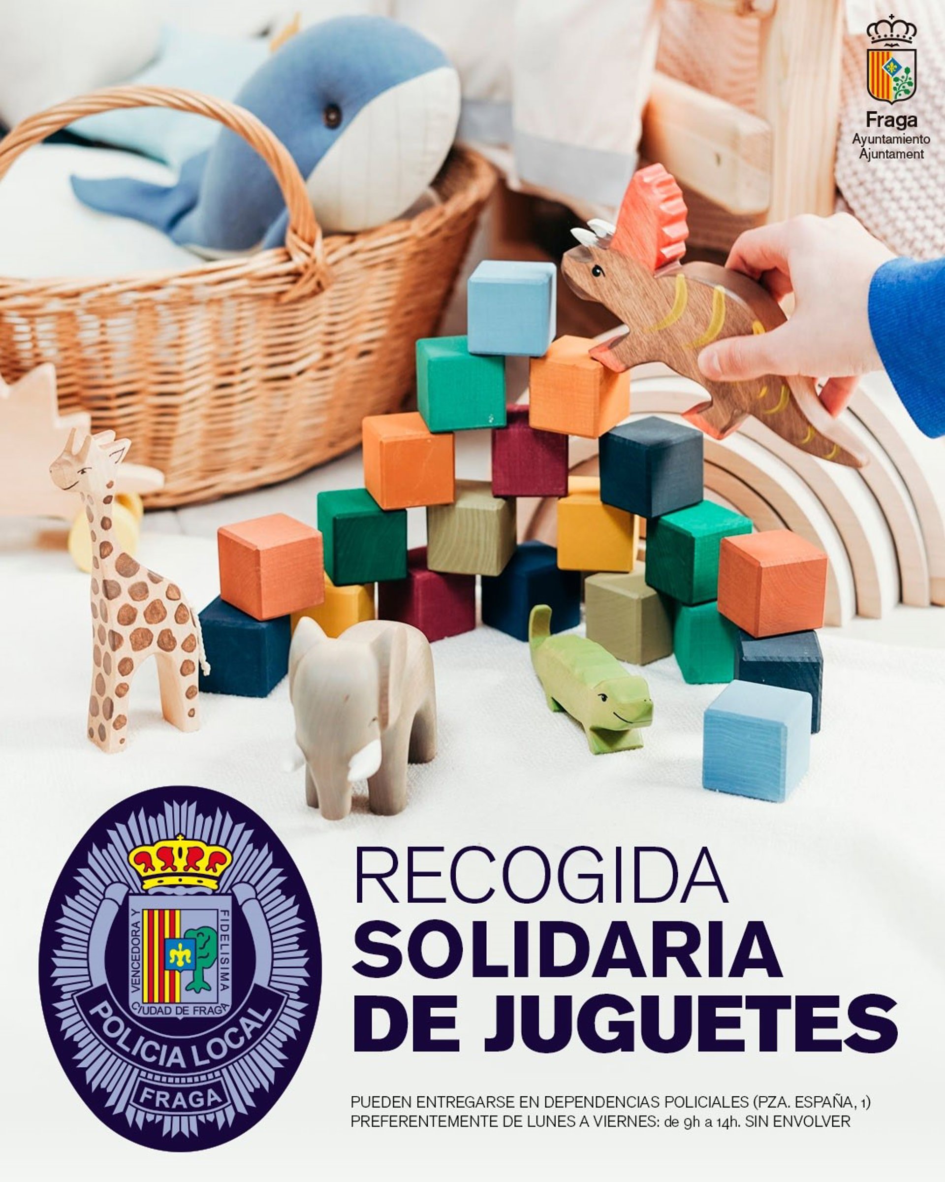 Todos los interesados podrán llevar los juguetes a las dependencias de la Policía Local de Fraga situadas en plaza España, 1, preferentemente en horario de lunes a viernes de 09.00 a 14.00 horas y sin envolver. Estas donaciones se entregarán a entidades sociales y familias con pocos recursos.