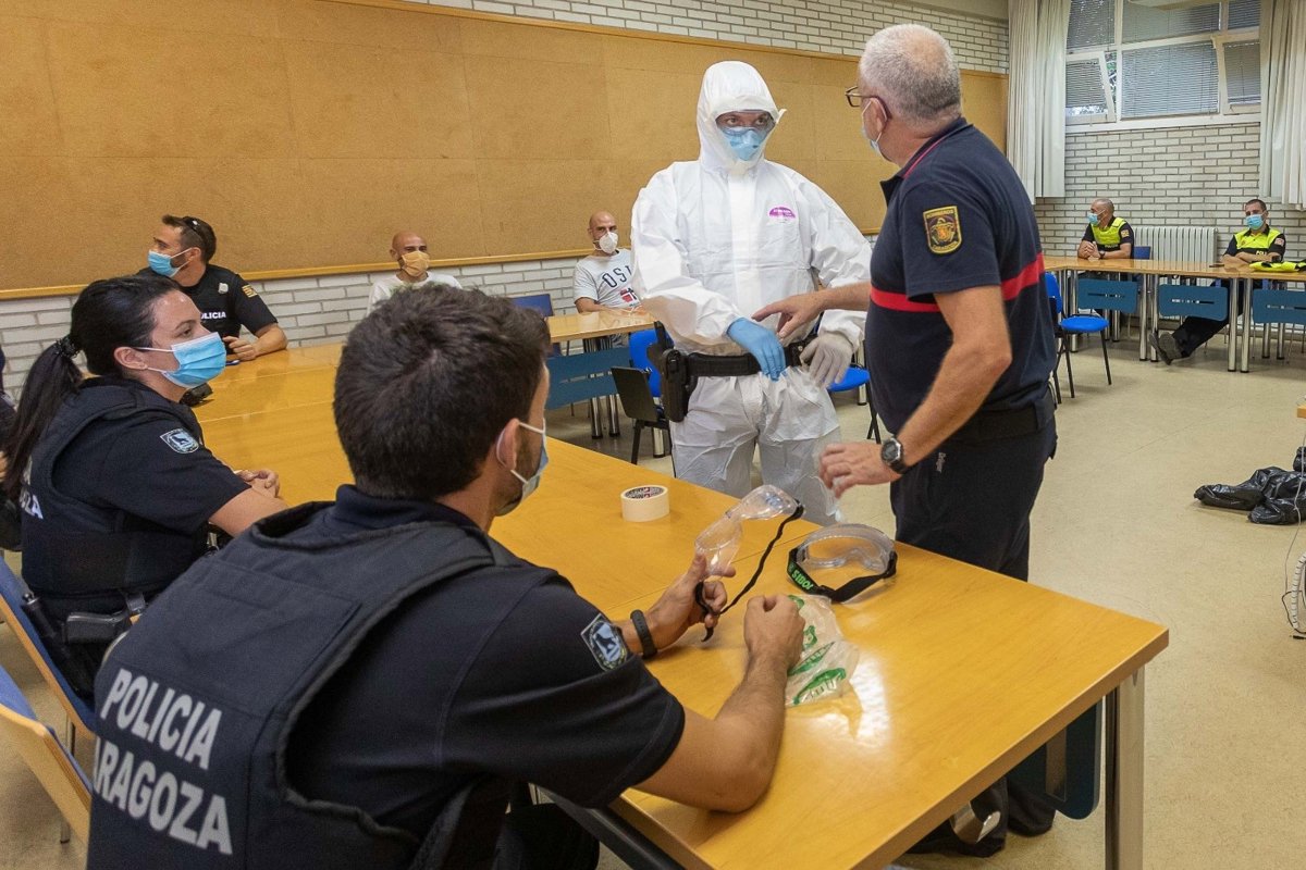 Un centenar de agentes de la Policía Local del Ayuntamiento de Zaragoza está recibiendo formación específica, impartida por efectivos del Cuerpo de Bomberos de Zaragoza, para la utilización de trajes de protección biológica con los que realizar las funciones encomendadas en el control domiciliario del distrito de las Delicias, coordinado por el Gobierno de Aragón para garantizar el cumplimiento del confinamiento de los casos positivos de la COVID-19.
